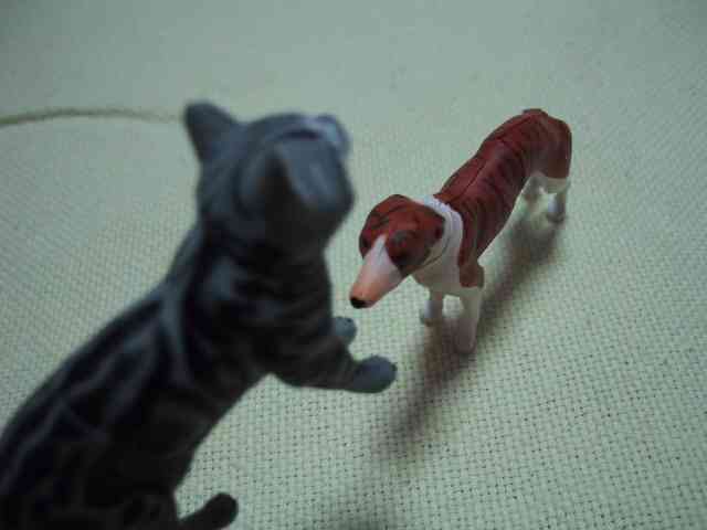 「ニャー!」チャッピーはポチに飛び掛かった!