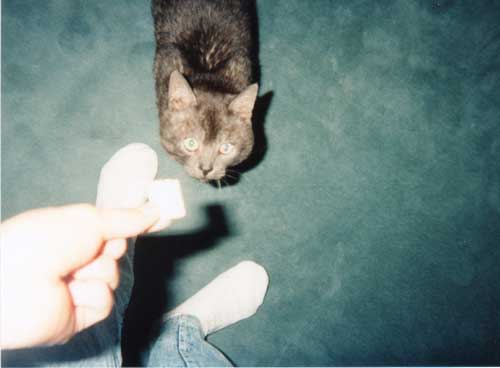 「ニャ〜ン?=^ω^=」 チャッピーは、お菓子をねだる時に 飛びきり可愛いお顔とお声で甘えます。 それにしても凄い変貌ぶりです ちょっと先程の顔と比較してみましょう ⇒ うわぁ‥全然違う!(笑) 次へ
