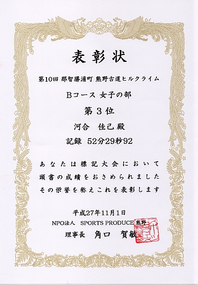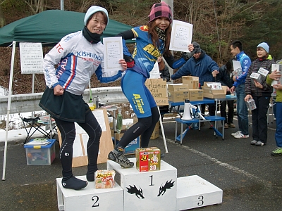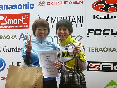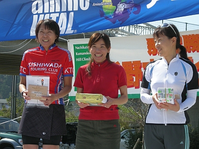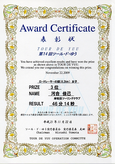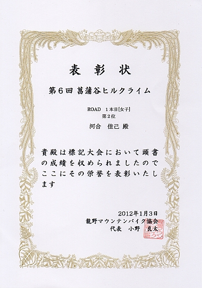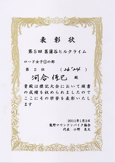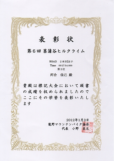 | 本人の意思確認もせず河合が勝手にエントリーして 始まったレース活動でしたが、レースで良い所を見せる前に 先に嫁さんが表彰台に立つという事態に!!や、やるじゃない・・ 穴があったら入りたかったですw 2009年10月18日 那智勝浦町熊野古道ヒルクライムレース Bコース ROAD女子の部 3位入賞 time 45:10:00 ![]() ![]() 2009年11月21日 ツール・ド・ゆう ロードレーサーの部女子 3位入賞 time 46:14 ![]() ![]() 2011年1月3日 菖蒲谷ヒルクライム ROAD女子(1)の部 準優勝 time 26:24 ![]() ![]() 2012年1月3日 菖蒲谷ヒルクライム ROAD女子1本目 準優勝 time 27:15 ![]() ![]() ROAD女子2本目 準優勝 time 27:54 ![]() ![]() 2015年4月19日 ツール・ド・八ヶ岳 女子小径車の部 優勝 time 1:26:27 ![]() ![]() 栄光の表彰台!オリンピアンの中込さんと一緒にパチリ 2015年11月1日 那智勝浦町熊野古道ヒルクライム Bコース女子の部 3位入賞 time 52:29:92 ![]() ![]() |