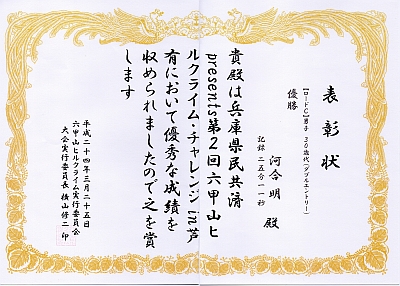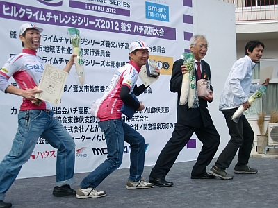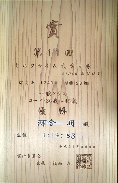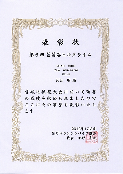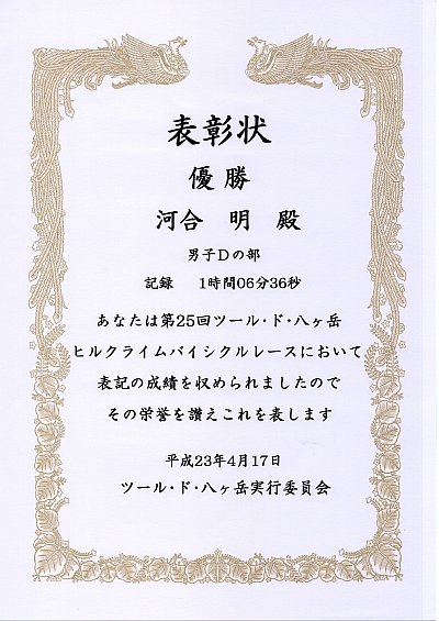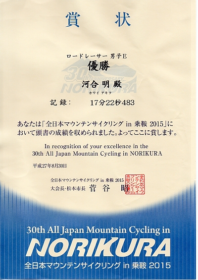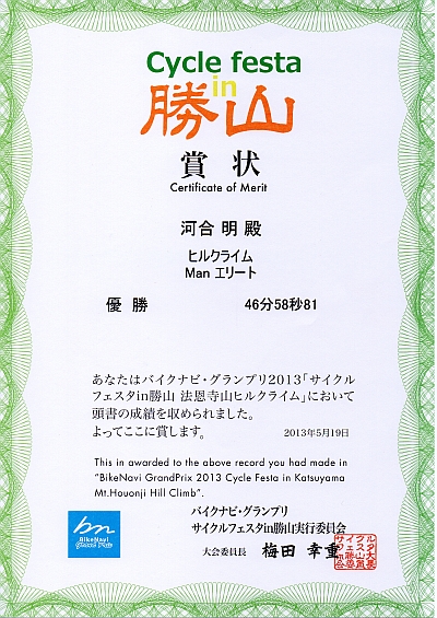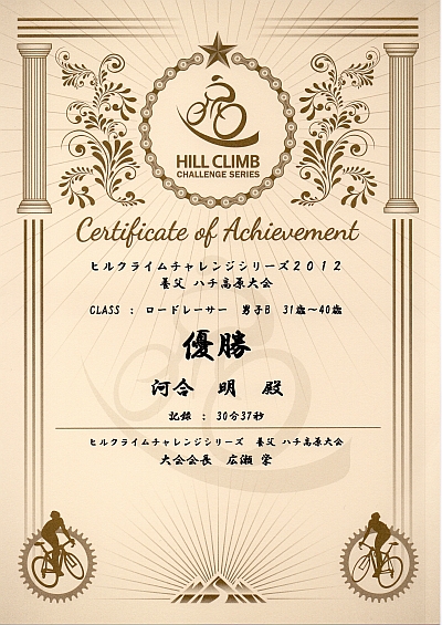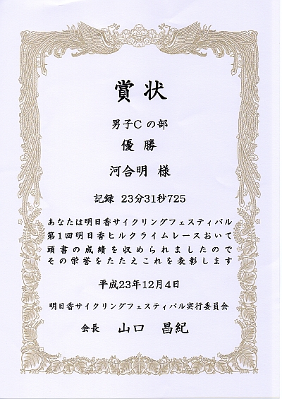 | 2011年4月17日 ツール・ド・八ヶ岳 ROAD 男子D 完走190名/1位(優勝) time 1:06:36 ![]() ![]() この時が初優勝でした 2011年12月4日 明日香ヒルクライム 男子Cの部 完走完走154名/1位(優勝) 合計time 23:31 (第1ヒート 12:32 第2ヒート 10:59) ![]() ![]() 2012年1月3日 菖蒲谷ヒルクライム ROAD男子2本目 完走14名/1位(優勝) time 14:54 ![]() ![]() 2012年3月25日 六甲山ヒルクライム チャレンジin芦有 ROAD Cシングル 完走156名/1位(優勝) time 12:22 ![]() ![]() ROAD Cダブル 完走55名/1位(優勝) time 25:11 ![]() ![]() 2012年9月9日 ヒルクライム大台ケ原 ロード男子一般クラス(36〜45歳) 完走196名/1位(優勝) time 1:14:53 ![]() ![]() 2012年11月18日 ヒルクライムチャレンジシリーズ2012 養父ハチ高原大会 ロード男子B 完走61名/1位(優勝) time:30:37:810 ![]() ![]() 2013年5月20日 バイクナビ サイクルフェスタin勝山 法恩寺山ヒルクライム 男子エリート 完走4名/1位(優勝) time 46:58:81(完走171名/総合1位) ![]() ![]() 上位クラスで初めて優勝 2015年8月30日 全日本マウンテンサイクリングin乗鞍(三本滝短縮コース) ROAD男子E(41〜50歳) 完走596名/1位(優勝) time 17:22:483 ![]() ![]() 2019年11月3日 第14回那智勝浦町熊野古道ヒルクライム妙法山阿弥陀寺コース 完走67名/1位(総合優勝) time 23:48.83 ![]() ![]() |
