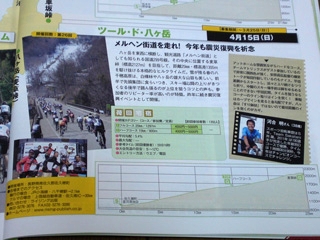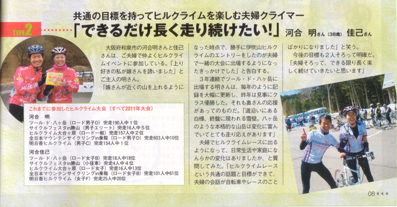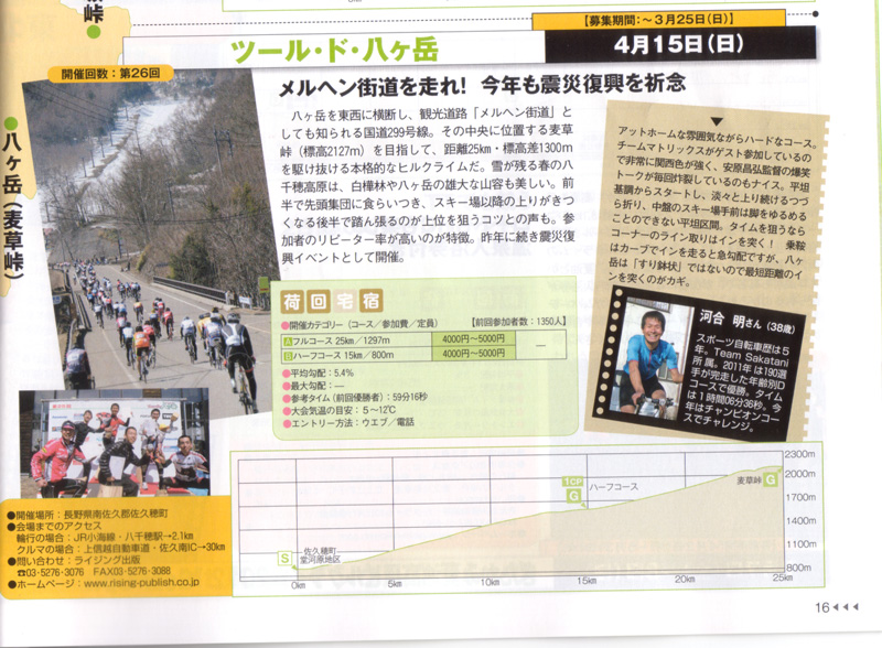 | サイクルスポーツ2012年4月号 別冊ロングライド&ヒルクライムイベント参加ガイドブックに 掲載して頂きました ![]() ツールド八ヶ岳の運営の方がサイクルスポーツ誌へ 河合を推薦して下さったとの事で取材を受けました ![]() 記事の画像リンク 夫婦サイクリストという事で別ページにも掲載して頂けました ![]() 記事の画像リンク この別冊、家宝にしていますw |