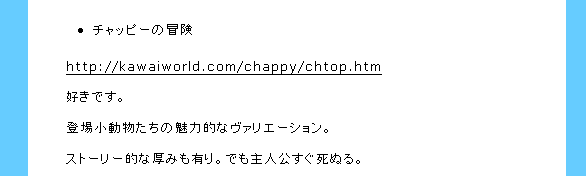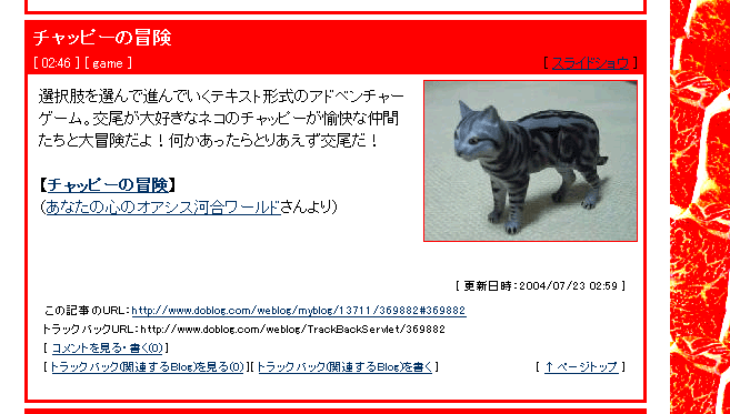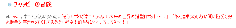 河合ワールド>チャッピーの冒険>Pya!に掲載されました>他サイト様からも紹介して頂きました 他サイト様からも紹介して頂きました(感謝) WIBOサーチランキング画像掲示板にて ネコドラくんキタ━━━━(゚∀゚)━━━━!!!!(感激) 紹介して下さったサイトの皆様、有難うございましたm(_ _)m 戻る