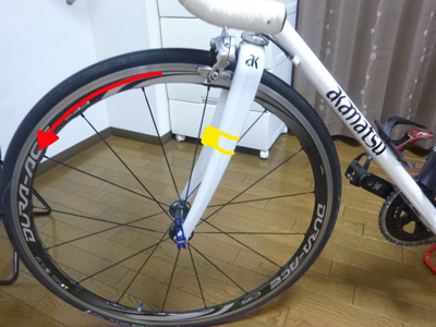 | *** センサーの取り付け *** まず大前提として自転車の「顔」はクランク側(右足側)です 写真を撮る時もクランク側をこちらに向けて撮るのが鉄則ですよね (河合はたまに意識し忘れて逆側から撮りますがw) なので野暮ったいセンサー類はクランクの逆側(左足側)へ 取り付けるのが見た目がスッキリしてオススメです (携帯ポンプの台座なども同じくクランク逆側が良いですね) 以下、前輪センサーの画像で説明しますが 後輪のケイデンス共用センサー等でも考え方は同じです 赤の矢印はホイールの回転方向 黄色のゴニョゴニョがセンサーだと思って下さい ちなみにこれは良くない取り付けの例です ![]() センサーをフロントフォークの後ろ側に付けている為 もし何かの弾み(車載、輪行、何かが当たったetc)で センサーが内側にずれてしまった際 スポークが当たるとセンサーは更に内側に「巻き込まれて」しまいます そうなったらセンサーもスポークもダメージ大! この取り付け方では機材へのリスクが増えてしまいます そしてこちらが良い取り付け方法です ![]() センサーをフロントフォークの前側に付けています この取り付け方ですと、もしセンサーが内側にずれて スポークと干渉してしまっても、センサーは外側へ「弾かれる」だけなので センサーやスポークのダメージも最小限で済みます 最初に書きました通り、リアのセンサーの場合も同様で、 スポークに巻き込まれず、弾かれる向きに取り付けるのが 安全でベターな取り付け方なのです。 *** マグネットの位置 *** マグネットはどこのスポークに取り付けるのが良いのでしょうか? アルミリムのホイールでの話になりますが・・・ ズバリ!バルブ付近がベターです ホイールのリムにはチューブからバルブを通す為の穴が開いています この丁度対角側がリムを繋ぎ合わせている接合部分になっています 接合部分はどうしても重くなり、バルブの重さよりも大抵重くなります バルブ側にマグネットを取り付けて重量バランスを良くする事で ホイールの回転ロスを少しでも減らす効果が狙えるのが理由です とは言え個体差があるので お手持ちのホイールにタイヤ、チューブを嵌めた状態で 何度か空転させてみて、上になった側(重量が軽い側)に マグネットを取り付けてあげるのが良いと思います。 余談になりますが・・・ こだわる方はゴルフのウエイトバランスプレートなどを 貼り付けて徹底的に回転バランスを追及されるそうです ↓こういう鉛のシールです ![]() 河合は(調整が面倒で)ここまではやっていませんが ロスを減らす効果はかなりあるらしいです *** まとめ *** ※センサーはクランク逆(左足)側へ 内側にズレた際、回転に巻き込まれない向きで取り付け ※マグネットは外したホイールを何度か回してみて 空転が止まる時、上に来る(軽い)側へ取り付け 以上、サイコンのセンサーやマグネット取り付けのお話でした。 |